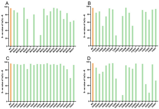 3.4. Site-Saturation Mutagenesis Library Construction and Enantioselectivity Analysis of M5 Mutants