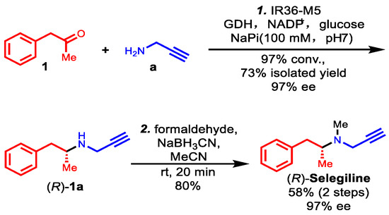 In order to produce the key intermediate (R)-desmethylselegiline 1a, phenylacetone 1 and propargylamine a were chosen as the model substrates for biocatalytic reductive amination. In our previous work, we have developed the weakly active IR36 into a variant IR36-M5 with high performance for the synthesis of azacyclo-alkylamines, with a 4139-fold improvement in catalytic efficiency and ee values (>99%, R) [39]. Consequently, we opted to utilize IR36-M5 as our initial enzyme to test our model study. As depicted in Table 1, the IR36-M5 mutant displayed significant stereoselectivity, reaching 97% in the R configuration toward substrate 1. We also tested several M5 mutants (M5-F260D, M5-F260E, M5-F260N, M5-W234L, and M5-W234I), which exhibited excellent stereoselective control in our pyrrolizidine alkylamine synthesis [38]. Most of these mutants exhibited relatively low to moderate enantioselectivity ranging from 52% to 85% (R) ee values. Disappointingly, the results show that these M5 mutants are not ideal biocatalysts to synthesize the key intermediate (R)-desmethylselegiline 1a.