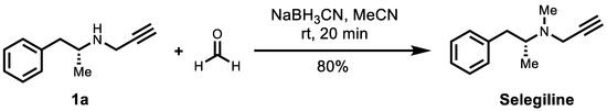 - Talluri, S.K.; Sudalai, A. An organo-catalytic approach to the enantioselective synthesis of (R)-selegiline. Tetrahedron 2007, 63, 9758–9763. [Google Scholar] [CrossRef]