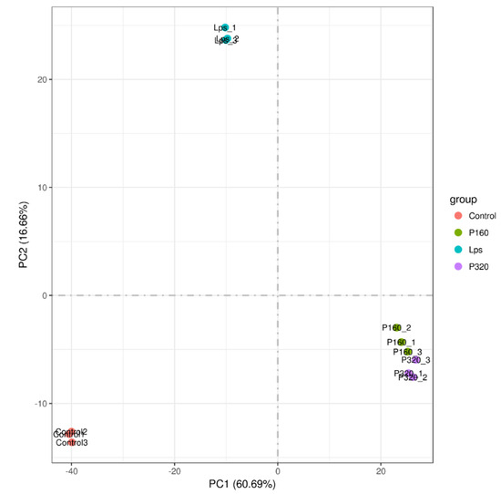Principal component analysis (PCA) is commonly used to assess between-group differences and within-group sample repetition. The results are shown in Figure 2. The samples within the four groups are basically clustered together, and the samples among the Con, LPS, 160 μg/mL polyphenol group (P160), and 320 μg/mL polyphenol group (P320) are scattered.