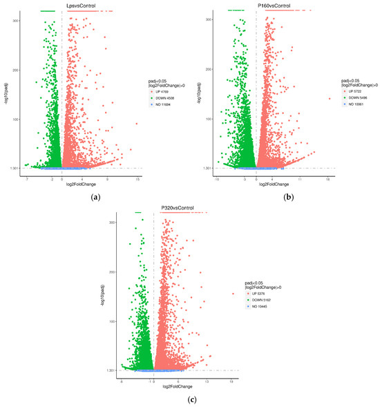All differential genes were counted and counted by the number of Log2 fold change. There were 9277 differential genes in LPS/Con, 11,218 differential genes in P160/Con, and 10,538 differential genes in P320/Con (Table 2). A volcano plot analysis was conducted for the gene expression between the above groups, with the horizontal coordinate indicating the fold change in expression and the vertical coordinate indicating the significance level of gene expression differences (Figure 3).