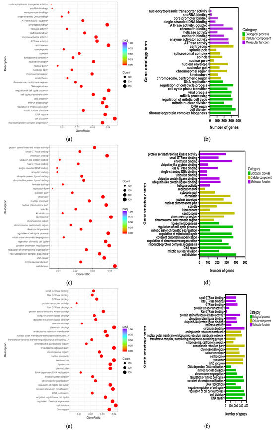 Biological process, cellular component, and molecular function are the three categories of the comprehensive GO (gene ontology) database that describes gene functions. In the LPS/Con, P160/Con, and P320/Con groups, the 10 most significant gene functions in the three sections were plotted as scatter plots and bar charts (Figure 4). The GO terms of the LPS/Con were mostly enriched in cell cycle, mitotic, and enzyme activity. The GO terms of the P160/Con were largely enriched in mitotic, enzyme activity, and binding process. The GO terms of the P320/Con were highly enriched in the cell cycle and binding process. Notably, both DNA repair and cell division appear in all three groups.