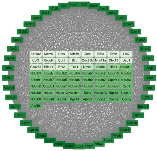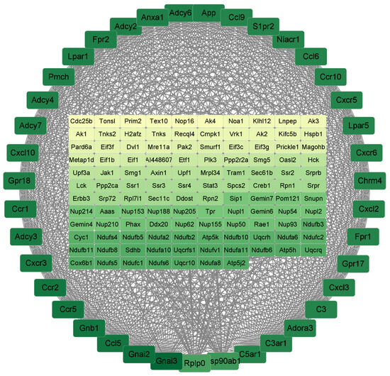 For the P160/LPS group, the results are shown in Figure 6. There are a total of 110 genes in it, arranged in order and color according to degree; the darker the color, the higher the degree. The degrees of the top 10 genes are shown in Table 6 below. All of them are associated with cytokine–cytokine receptor interaction.