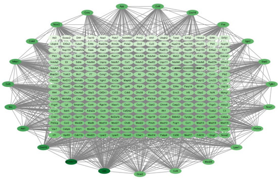 Protein–protein interaction network (PPI) results were based on DEGs. The results use DEGs from LPS/Con, P160/Con, and P320/Con. The raw network was built by Cytoscape for Visualizing Molecular Interaction Networks. After building the raw network, significant sub-networks and connectivity were analyzed with MCODE and CytoNCA. For the LPS/Con group, the results are shown in Figure 5. There are a total of 156 genes in it, arranged in order and color according to degree; the higher the degree, the darker the color. The degrees of the top 10 genes are shown in Table 5 below. All of them are associated with cytokine–cytokine receptor interaction.