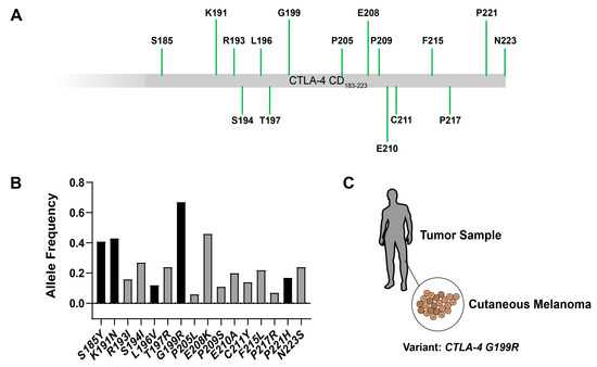 First, we directed our focus towards the investigation of genetic mutations in the cytoplasmic domain of CTLA-4 associated with cancer. Using cancer genomic datasets from cBioPortal [33,34,35], we identified a series of point mutations in the cytoplasmic domain of CTLA-4, detected in tumor samples. These mutations spanned various residues, notably including S185Y, K191N, R193I, S194I, T197R, G199R, P205L, E208K, among others (Figure 1A). To further comprehend the prevalence and distribution of these mutations across different cancers, we conducted an allelic frequency analysis, drawing data from diverse sources, such as The Cancer Genome Atlas (TCGA) PanCancer Atlas and Memorial Sloan Kettering Cancer Center (MSK) [36,37]. The results of our analysis demonstrated that the G199R mutation found in TCGA-DA-A1HV and SP82900 samples [36,38], which might be highly relative to cutaneous melanoma, exhibited the highest frequency within the CTLA-4 cytoplasmic domain (Figure 1B,C). However, the functional consequences of this mutation on CTLA-4 activity and its potential role in tumor survival remain to be fully understood.
