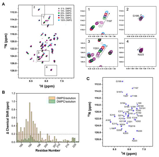 Subsequently, we applied solution NMR spectroscopy to further delineate the interaction between CD183–223 and the membrane, following a previously reported protocol [40]. The backbone resonance assignments of CD183–223 in buffer solution were achieved through a standard suite of triple resonance experiments (Figure S2A). 15N-labeled CD183–223 was then reconstituted into bicelles composed of zwitterionic DMPC and 1,2-dihexanoyl-sn-glycero-3-phosphocholine (DH6PC) at a molar ratio of q = 0.7. Subsequently, we altered the lipid composition by incorporating varying proportions of DMPG into the DMPC/DH6PC bicelles (Figure 2A). Two-dimensional (2D) 1H-15N transverse relaxation optimized spectroscopy (TROSY) experiments were employed to monitor chemical shift perturbations. Notably, CD183–223 in DMPC/DH6PC bicelles (q = 0.7) exhibited little detectable chemical shift differences compared to the protein in buffer solution (Figure 2B and Figure S2B). Conversely, CD183–223 in acidic DMPG/DH6PC bicelles (q = 0.7) displayed significant chemical shift alterations and changes in peak intensities in the majority of N-terminal resonance peaks (Figure 2B and Figure S2C,D). These results strongly suggested the specific binding of CD183–223 to acidic phospholipids within the bicelles.