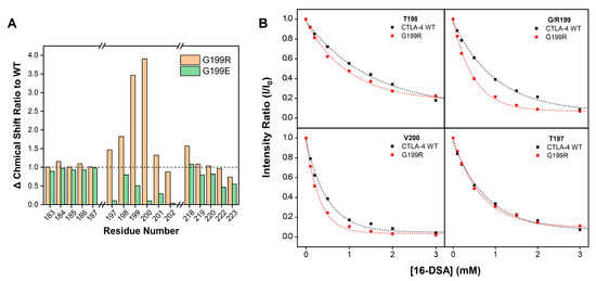 Subsequent to the chemical shift perturbation analysis, a 16-DSA titration experiment was conducted to probe the interaction of the G199R mutant within membrane mimetics. The results of this titration showed a faster decay rate and higher PREamp, particularly in the residues T198-Y201, than WT, indicating that the interactions between these residues and the membrane increased under the influence of the G199R mutation (Figure 3B). This is likely due to the enhanced electrostatic interactions between the positively charged arginine residue and negatively charged phospholipids. These findings collectively suggest that the G199R mutation fosters a stronger association with the membrane, potentially modulating CTLA-4 inhibitory signal transduction.
