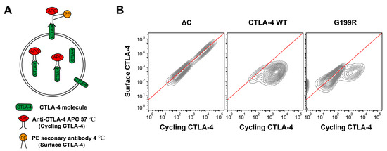 Endocytosis analysis of CTLA-4 for the WT, G199R, and ΔC mutant. (A) Diagram of the antibody labeling strategy for flow cytometry experiments in (B). (B) Jurkat cells expressing different CTLA-4 were labeled with anti-CTLA-4 APC at 37 °C for 30 min, followed by labeling surface CTLA-4 on ice (4 °C) with a fluorescently conjugated anti-mouse secondary antibody (PE) for 1 h. Cells were then analyzed by flow cytometry.