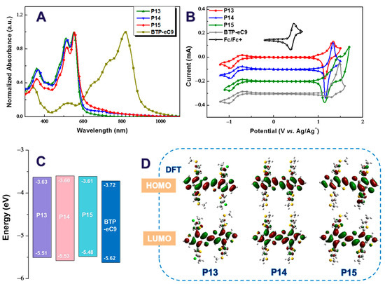 UV-vis absorption spectra (A), CV charts (B), molecular energy levels (C), and the calculated electron distributions of the HOMO/LUMO orbitals (D) of the polymers P13, P14, and P15 and the acceptor BTP-eC9.