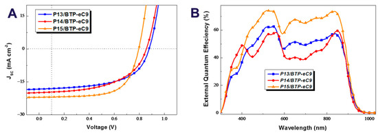 J–V curves (A) and EQE plots (B) of the optimal OPV devices based on the three homopolymers P13, P14, and P15.