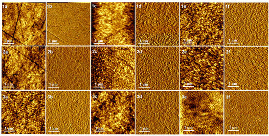 AFM height and phase diagrams of the thin films of pristine P13 (height 1a, phase 1b), pristine P14 (height 2a, phase 2b), pristine P15 (height 3a, phase 3b), P13:BTP-eC9 (height 1c, phase 1d), P14:BTP-eC9 (height 2c, phase 2d), P15:BTP-eC9 (height 3c, phase 3d), P13:BTP-eC9 with 0.1% DIO (height 1e, phase 1f), P14:BTP-eC9 with 0.1% DIO (height 2e, phase 2f), and P15:BTP-eC9 with 0.1% DIO (height 3e, phase 3f); 4 µm × 4 µm.
