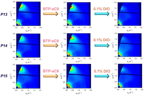 Furthermore, to investigate the in-plane crystallization and morphology of the thin films based on the three homopolymers, a GIWAXs analysis was applied, which revealed more detailed information about the molecular arrangement in the active layers [23,24]. As shown in Figure 5 (left), the three homopolymer-only thin films mainly formed a face-on orientation stacking arrangement, while they also had a partly edge-on-oriented molecular arrangement. After blending with BTP-eC9, as seen in Figure 5 (middle), all the homopolymers underwent significant changes. For P13 and P14, the blended thin films both showed an obvious enhancement in terms of a face-on orientation stacking arrangement. Meanwhile the P15-based devices underwent a significant increase in terms of an edge-on orientation stacking arrangement, and their face-on orientation stacking arrangement also had a slight enhancement. After incorporating 0.1% DIO (Figure 5, right), all the blended thin films became dominated by an edge-on orientation stacking arrangement. Except for P15, the face-on orientation arrangements of the others almost totally disappeared, which indicated an increase in the electron transport properties and a decrease in the hole transport properties of their OPVs. However, an excellent organic semiconductor device requires a balance between hole and electron transport properties [25].