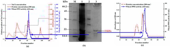 The Superdex G-75 chromatography column (16 mm × 600 mm) (Beijing Ruida Henghui Technology Development Co., Ltd., Beijing, China) was then applied to further purify wheat PPO. The column was washed and equilibrated with phosphate buffer (50 mM pH 7.0) before use. Freeze-dried enzyme powder was dissolved in the same buffer; the dissolved enzyme solution was passed through the Superdex G-75. The column was eluted with the same buffer at the flow rate of 0.3 mL/min, and fractions of 3 mL were collected every 10 min. Enzyme activity and protein content were determined during purification. The high-PPO active components of wheat were collected and concentrated with an ultrafiltration membrane (10 kDa), freeze-dried, and preserved at −18 °C for analysis.