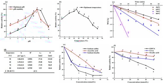 Partial enzymatic properties of purified wheat bran PPO. (a) Optimal pH and stability of purified wheat bran PPO. (b) Effect of temperature on the activity of purified wheat bran PPO. (c,d) Thermal inactivation of purified wheat bran PPO at different temperatures. (e,f) Effects of various inhibitors ((e) reducing agent; (f) chelating agent) on the activity of purified wheat bran PPO. Different lowercase letters show significant differences (p < 0.05).