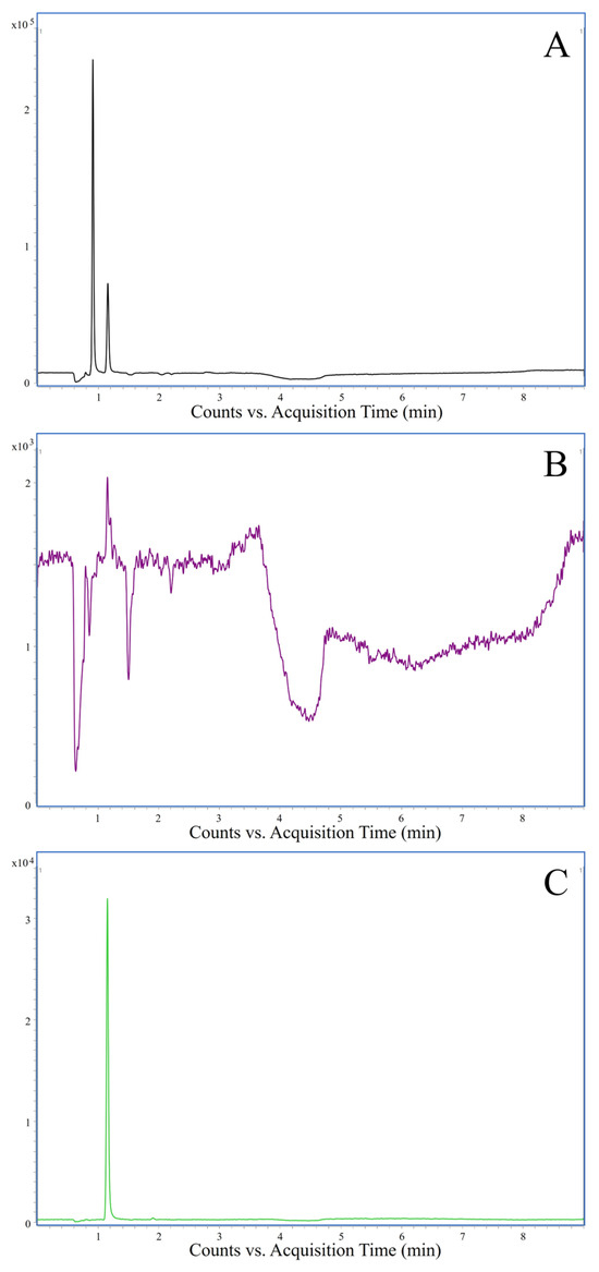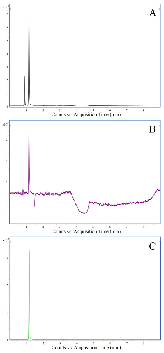 Chromatograms of a fish oil sample with analyte concentrations below the LOQ. (A) Total ion chromatogram; (B) chromatogram of the quantifier transition of TMA; (C) chromatogram of the quantifier transition of TMAO.