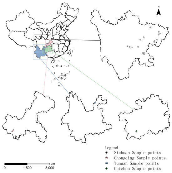 Z. armatum samples were selected from 24 main prickly ash-producing areas through the local Forestry Bureau or prickly ash planting companies (Figure 5). The provinces of Sichuan, Yunnan, Guizhou, and Chongqing are the main production areas of Z. armatum [6]. In this experiment, the fruits of Z. armatum with better appearance and quality were selected for harvesting in May–July 2022. The collected Z. armatum fruits were dried and deseeded to obtain dry pericarp (moisture content less than 10.5%), with a sampling volume of 5–10 kg. The dry pericarp was crushed, passed through a 60-mesh sieve, and stored in a refrigerator at −20 °C for backup.
