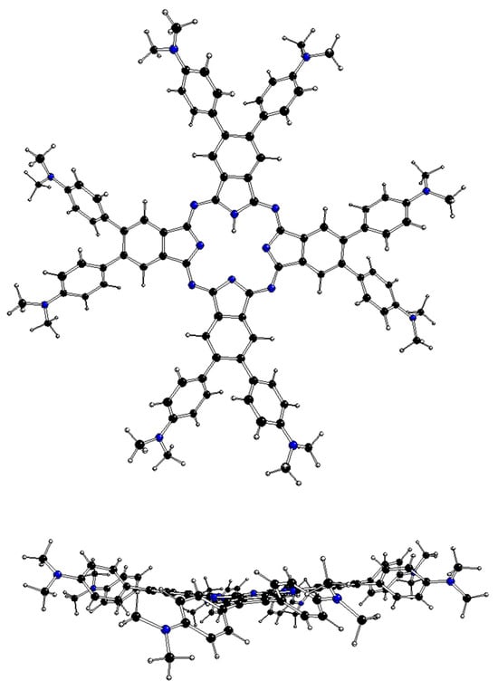 DFT-optimized structure of 1[dmaphPcH]− in CHCl3—above (top) and side (bottom) views (C—black, N—blue, H—white).