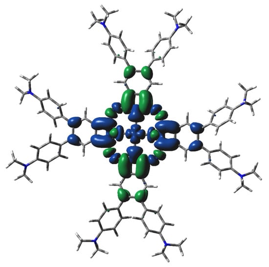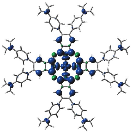 DFT-calculated spin density of 3[dmaphPcAg]+ in CHCl3 (0.001 a.u. isosurface, blue—positive, green—negative spin density).