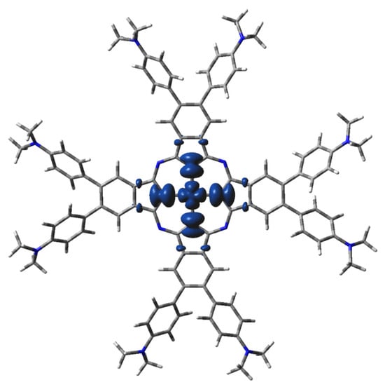 The results of our ‘broken symmetry’ DFT calculations indicate the nonexistence of singlet biradicals. According to the energy data, the 3[dmaphPcAg]+ concentration should dominate over their singlet counterparts, but the UV-vis spectra [23] do not confirm their presence in reaction systems. Based on EPR measurements, this can be explained by the very low stability of 3[dmaphPcAg]+, which was detected using spin traps only [23]. Moreover, only this species has a non-vanishing spin density at Namin atoms (see Figure 5) as proposed in [23]. The calculated electron transitions of the EPR silent 1[dmaphPcAg]+ species do not agree with UV-vis spectra [23] and so it is not present in reaction solutions.
