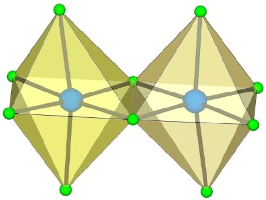 In C(NH2)3]3[Ti6F27]·SO2, the [Ti6F27]3− anion consists of six TiF6 octahedra (Figure 18) [22]. Three TiF6 octahedra form a trimeric ring by sharing cis-vertices. Two such rings are connected via the bridging fluorine atoms and form a trigonal-prismatic geometry. In this way, all titanium atoms are coordinated with three Ft and three Fb atoms, which are located in the fac positions. The bond lengths of Ti–Ft and Ti–Fb are 1.754(1)–1.788(1) and 1.943(1)–2.010(1) Å, respectively [22].