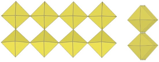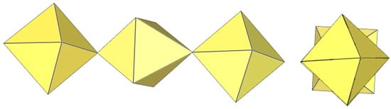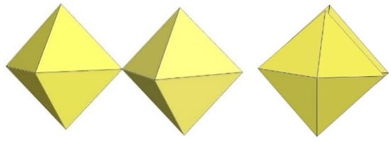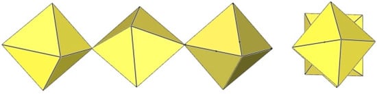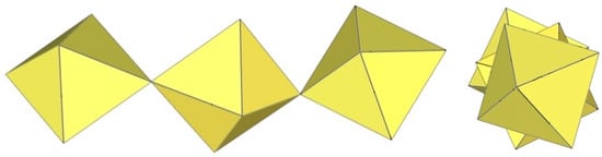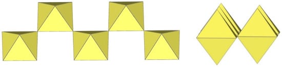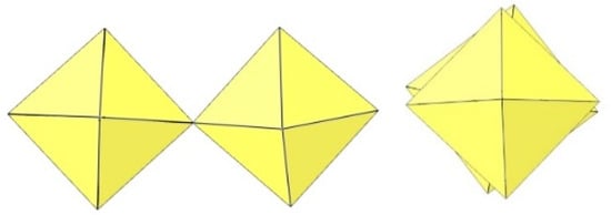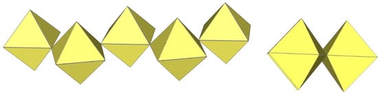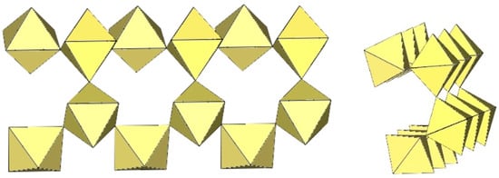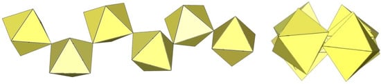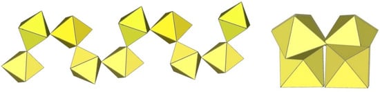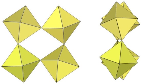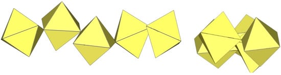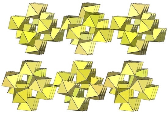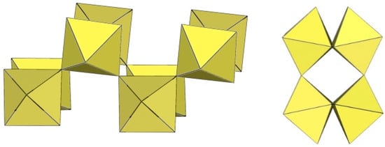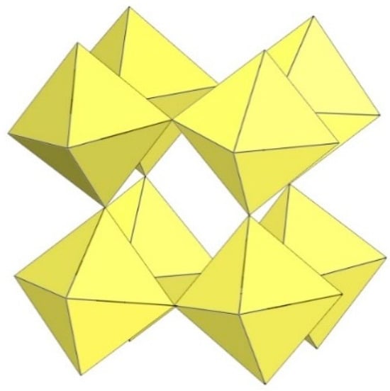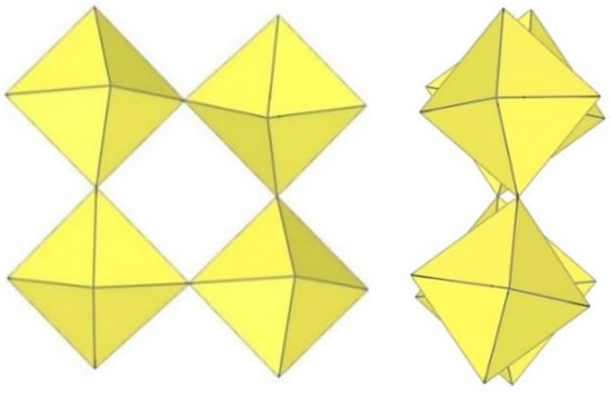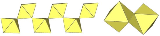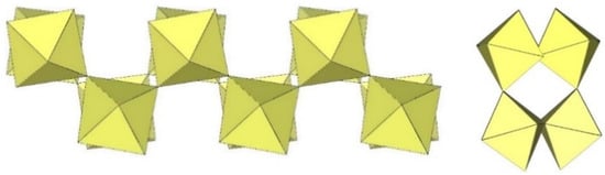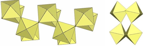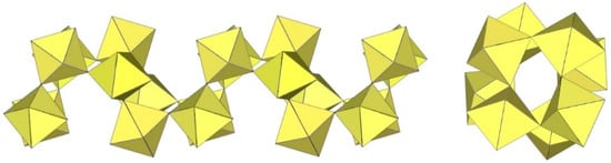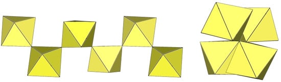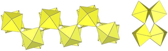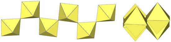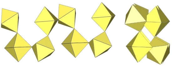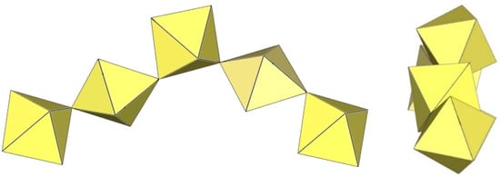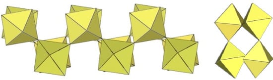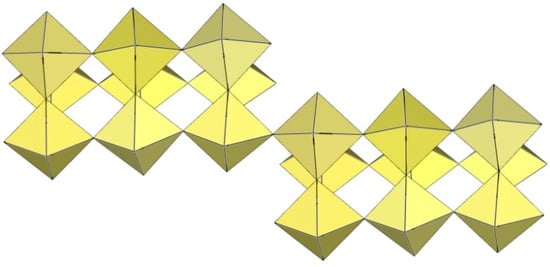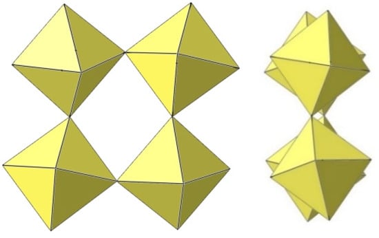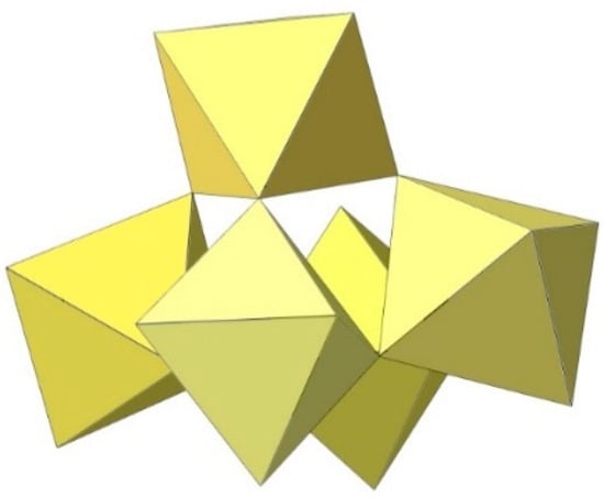 In the study of the imidazole–TiF4-HF system, single crystals of the compound [ImH]8−n[X]n[Ti8F36][Ti6F28] were grown [23]. Its crystal structure contains two different perfluoridotitanate (IV) anion–cubic [Ti8F36]4− octamers and a hexameric [Ti6F28]4− anion. Unfortunately, it was not possible to accurately determine all cations in the crystal structure, but the proposed models of the anions are well refined. The [Ti6F28]4− anion has a very unusual geometry (Figure 19). In the centre are two TiF6 octahedra that share a vertex. Attached to this pair is a TiF6 unit that shares a fluorine atom with each of the octahedra. There is also a chain of three TiF6 octahedra in which each octahedron at the end of the chain shares two vertices with two octahedra in the centre of the [Ti6F28]4− anion.
