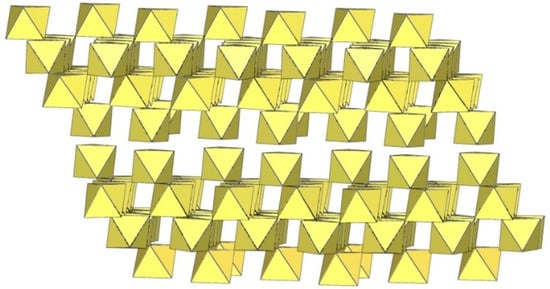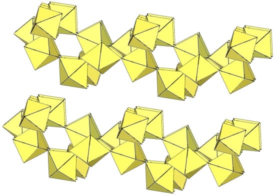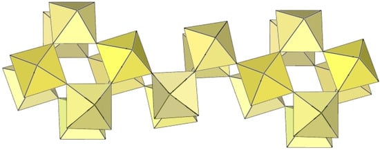 The ([Ti6F27]3−)∞ anion is a three-dimensional framework consisting of TiF6 octahedra (Figure 61). Its structure can be described as composed of non-planar tetrameric Ti4F20 units consisting of four octahedra, each sharing two cis-vertices. Each Ti4F20 unit is connected to four other Ti4F20 units so that each TiF6 octahedron of a tetrameric ring is connected to another tetrameric unit. There are two types of channels in the crystal structure of the ([Ti6F27]3−)∞ anion. The channels are occupied by cations and probably also by molecules of the solvent.