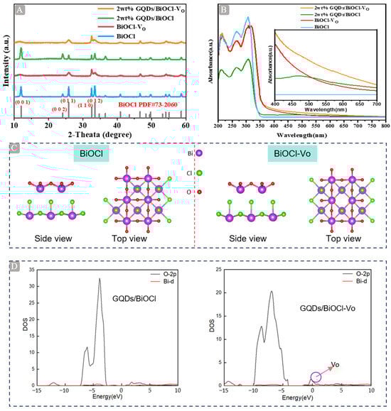 Figure 1. (A) XRD pattern of BiOCl, BiOCl-VO, 2 wt% GQDs/BiOCl, and 2 wt% GQDs/BiOCl-VO. (B) UV-vis DRS pattern of BiOCl, BiOCl-VO, 2 wt% GQDs/BiOCl, and 2 wt% GQDs/BiOCl-VO (inset image: enlarged UV-vis DRS pattern). (C) Crystal structure of BiOCl and BiOCl-VO. (D) Partial density of states (PDOS) of GQDs/BiOCl and GQDs/BiOCl-VO. Note: the colored balls represent different atoms: red, oxygen (O); green, chlorine (Cl); purple, bismuth (Bi).