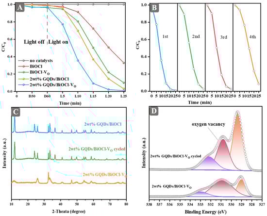 To evaluate the potential application and commercial value of the photocatalysts, cycling experiments were carried out under identical conditions. After each recycling run, the sample was washed with water and ethanol, and dried overnight at 60 °C before being reused. The degradation efficiency of 2 wt% GQDs/BiOCl-VO decreased after four cycles, as shown in Figure 4B. To investigate the reasons for the decrease in activity, XRD and XPS analyses were performed on the catalysts after four cycles. Figure 4C demonstrates that the cycled 2 wt% GQDs/BiOCl-VO had better crystallinity than the pristine 2 wt% GQDs/BiOCl-VO. Unexpectedly, the crystallinity of the cycled 2 wt% GQDs/BiOCl-VO might have been transformed to match that of BiOCl. Evidently, high crystallinity indicates fewer defects on the catalyst [37]. According to Figure 4D and Table S3, the relative peak area of oxygen vacancy decreased for the cycled sample, indicating that oxygen vacancy was unstable during the reaction.
