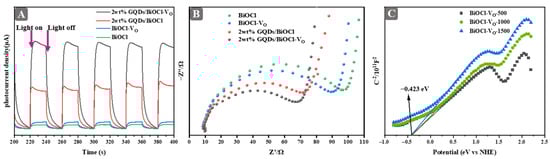 The separation of photogenerated carriers is essential in photocatalysis. Theoretically speaking, both the electron accumulation and the formation of oxygen vacancies contribute to the migration of electrons, which further enhances the separation efficiency of photogenerated carriers [38,39]. The photocurrent responses of 2 wt% GQDs/BiOCl-VO, 2 wt% GQDs/BiOCl, BiOCl-VO, and BiOCl samples after deposition on ITO electrodes are displayed in Figure 5A. The order of photocurrent intensities was 2 wt% GQDs/BiOCl-VO > 2 wt% GQDs/BiOCl > BiOCl-VO > BiOCl. This finding elucidated that the integration of oxygen vacancy and GQDs helped enhance the separation of photogenerated carriers [31]. Furthermore, electrochemical impedance spectroscopy (EIS) analysis provided a useful tool for assessing the efficiency of charge pair transfer, as illustrated in Figure 5B. The Nyquist curve arc represents the charge transfer resistance within the material system [40]. The smaller diameter of the EIS Nyquist curve arc indicates a faster separation of photogenerated carriers. Evidently, the arc radius of the 2 wt% GQDs/BiOCl-VO sample is the smallest of all the samples, indicating that this sample has a low impedance with a high carrier separation efficiency. The results reflected in the EIS Nyquist curve are in agreement with the photocurrent. The test further demonstrated that the synergetic effect of oxygen vacancy and GQDs is an efficient approach to enhance the separation of photogenerated carriers of catalysts. Consequently, this method has displayed promise in delivering excellent photocatalytic performance for various applications.