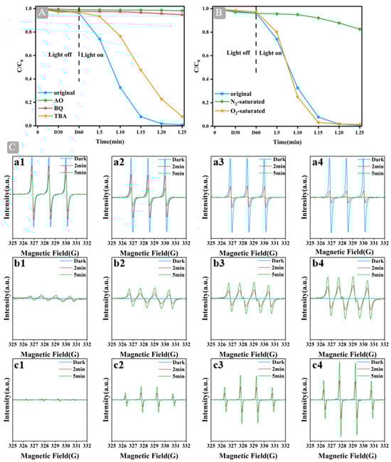 The active species of the 2 wt% GQDs/BiOCl-VO were determined using radical trapping experiments and ESR technology. To assess the impact of diverse reactive radicals on the degradation of RhB, trapping experiments were carried out with various scavengers, including ammonium oxalate (AO), p-benzoquinone (BQ), and tert-butanol (TBA), to capture h+, hydroxyl radicals (·OH), and ·O2, respectively (Figure 6A). The trapping experiments showed that h+ and ·O2 were the main active species and that the ·OH radical played a certain role in the reaction. In an attempt to investigate the degradation of RhB by dissolved oxygen, nitrogen and oxygen were introduced during the degradation process (Figure 6B). The admission of nitrogen diminished the photocatalytic performance; dissolved oxygen played a significant role in the degradation of RhB. Notably, the introduction of dissolved oxygen did not substantially improve the performance. Based on the effect resulting from the loss of oxygen vacancy and the enhancement of the formation of ·O2 free radicals, the initial performance was similar to that observed prior to the introduction of dissolved oxygen [43]. The above XPS analysis of 2 wt% GQDs/BiOCl-VO cycled also confirmed this result. Therefore, dissolved oxygen had a considerable influence on the GQDs/BiOCl-VO system.
