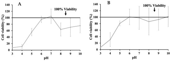 Effects of changing pH of DMEM supplemented with 10% FBS on cell viability evaluated through MTT assay after 3 h (A) and 24 h (B).