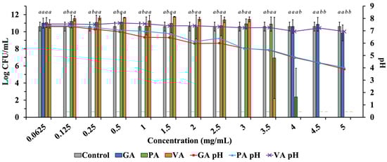 Testing increasing concentrations of GA, PA, and VA in DMEM supplemented with 10% FBS to determine the antimicrobial profile of phenolic acids when tested in DMEM, along with the corresponding pH at given concentrations. Statistically significant differences (p < 0.05) between treatments when compared to the untreated control at their respective time points were denoted with letters a-b. Differences between treatments were evaluated using ANOVA with a significance level set at p < 0.05.