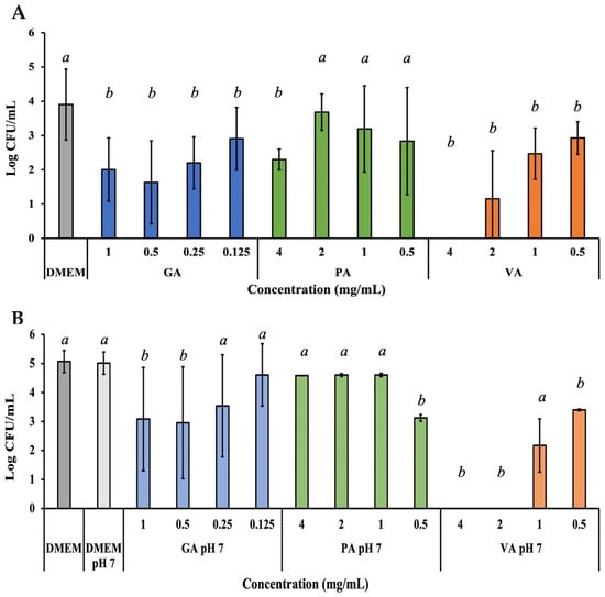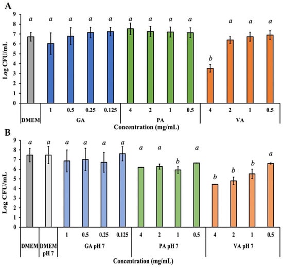 Bacterial quantification of ST adhered to INT-407 cell monolayer after 3 h of incubation with a treatment dose of either GA, PA, or VA in DMEM supplemented with 10% FBS at their normal pH (A) or adjusted to a pH of 7 (B). Statistically significant differences (p < 0.05) between treatments when compared to the untreated control at their respective time points were denoted with letters a-b. Differences between treatments were evaluated using ANOVA with a significance level set at p < 0.05.