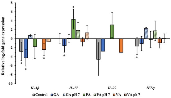The total RNA was collected from INT-407 cell monolayer individually treated with each phenolic acid to evaluate changes in the relative expression of genes associated with inflammatory cytokine production using qRT-PCR (Figure 7). Average Cq values were recorded and normalized with GAPDH as the housekeeping genes, with an untreated sample serving as the control, while results were represented in Log form. Infected cells showed a significant (p < 0.05) downregulation of IL-1β to −2.82 Log, while there was a numerical decrease in IL-22 and IFNγ to −4.57 and −1.63 Log, respectively. When treated with GA, there was a greater significant reduction in IL-1β and IL-17 to −4.26 and −1.53 Log. Conversely, treatment with PA upregulated IL-17 expression to 4.34 Log, while VA downregulated IL-1β to −2.40 Log. Changing the pH of GA to 7 showed a numerical upregulation of 0.76 Log for IL-1β and 2.33 Log in IFNγ, while pH adjusted pH had an upregulation of 1.86 Log and 1.78 Log for IL-17 and IFNγ. For samples from pH-adjusted treatments, there was no expression of IL-22.