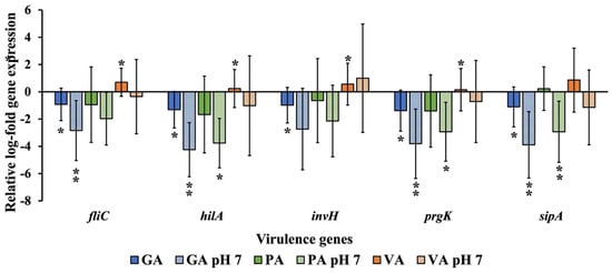 Relative expression of ST virulence genes during infection gave insight into the mechanism that might be behind the inhibition of invasion. Among the genes tested that are directly associated with invasion, hilA is a major transcriptional regulator, invH is mainly responsible for protein translocation, prgK is a structure protein that serves as the base of the T3SS, while sipA has been shown to be critical in the manipulation of actin filaments, mediating bacterial entry [54,55,56,57]. On the other hand, though fliC is not directly associated with invasion, it is still considered an important virulence factor since it mediates motility that can help bypass host defenses [58]. GA had a significant downregulatory effect, which was further reduced by adjusting to pH 7. In the case of VA, upregulation of the virulence genes was tested, suggesting a difference in mechanism of action, considering that VA was able to reduce invasion.