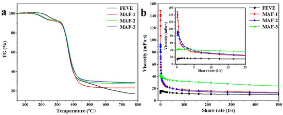 (a) TG spectra of the MAF adhesive with different concentrations; (b) viscosity–shear rate diagram of the MAF adhesive with different concentrations.