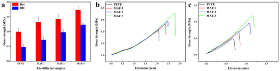 The shear strength of the wooden samples bonded with the MAF adhesives (a); stress–displacement curves for the wooden samples bonded using adhesives after drying (b) and after high RH degradation (c).