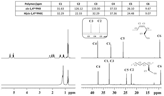 The successful complete hydrogenation of the diene polymer was confirmed by comparison of the Fourier transform infrared (FT-IR) (Figure S1) and 1H and 13C NMR spectra (Figure 1) of the starting cis-1,4 poly(1,3-diene) and of the corresponding hydrogenated product.