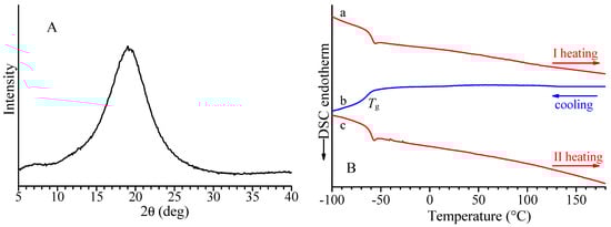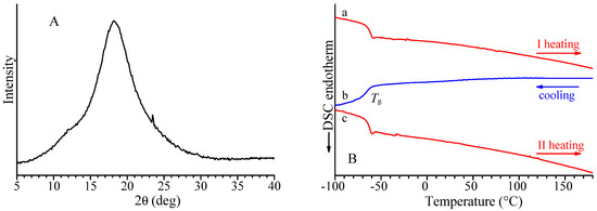 X-ray powder diffraction profile (A) and DSC curves (B) recorded at 10 °C/min during first heating (a), successive cooling (b), and second heating (c) of alternating E/1-B copolymer (sample H(cis1,4isoPHX)).