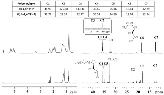1H (left) and 13C NMR (right) spectra of isotactic cis-1,4 poly(1,3-hexadiene) ((top), (cis1,4isoPHX)) and its saturated E/1-B copolymer ((bottom), H(cis1,4isoPHX)).