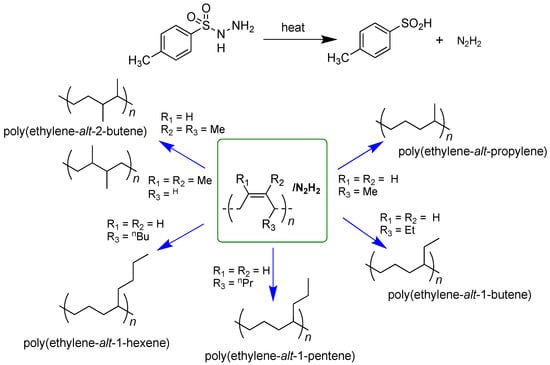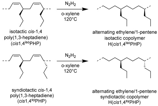 In this work, we exploited the non-catalytic hydrogenation with diimide in homogeneous conditions at 120 °C, with o-xylene as solvent, of the following highly stereoregular polydienes: isotactic cis-1,4 poly(1,3-hexadiene), isotactic cis-1,4 poly(1,3-heptadiene), isotactic cis-1,4 poly(1,3-octadiene), syndiotactic cis-1,4 poly(1,3-heptadiene), syndiotactic cis-1,4 poly(1,3-octadiene). The hydrogenation process converted the cis-1,4 poly(1,3-hexadiene), poly(1,3-heptadiene)s, and poly(1,3-octadiene)s into perfectly alternating ethylene/1-butene, ethylene/1-pentene and ethylene/1-hexene copolymers (Scheme 1), having iso- or syndiotactic structure as a function of the starting diene polymer, respectively.
