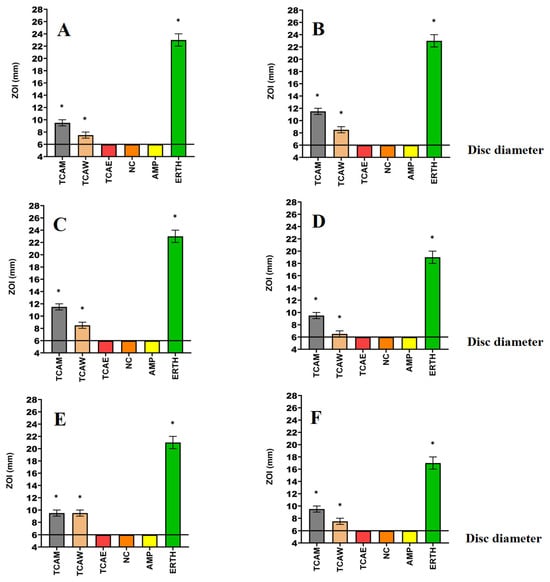 Antimicrobial effects of the T. canescens leaf extracts against (A) K. pneumoniae, (B) ESBL K. pneumoniae, (C) S. aureus, (D) MRSA, (E) E. coli and (F) ESBL E. coli. TCAM = Terminalia canescens methanol, TCAW = Terminalia canescens water, TCAE = Terminalia canescens ethyl acetate extract. Positive controls = ampicillin (AMP; 2 µg) and erythromycin (ERTH; 10 µg). Negative control (NC) = water. Results are expressed as mean zones of inhibition of three independent replicates ± SEM (n = 3). * indicates that the results are significantly different to the negative control (p < 0.01).