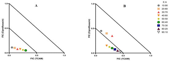 (A) Isobologram analysis of the TCAM and ciprofloxacin combination when tested at multiple ratios against E. coli; (B) Isobologram of ratios of TCAW extract in combination with ciprofloxacin against K. pneumoniae. FIC values are displayed as the means of two independent repeats (n = 2). Ratio = % extract: % antibiotic. Values below the 0.5/0.5 line represent synergy; the segment between the 0.5/0.5 and 1/1 lines represents additive interactions. Only the synergistic and additive ratios are displayed in these graphs.