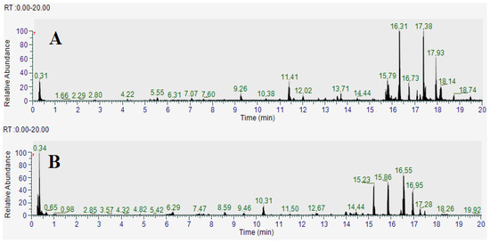 Total compound LC-MS chromatograms in positive ionization mode of (A) TCAM (T. canescens methanol) and (B) TCAW (Terminalia canescens water) extracts.