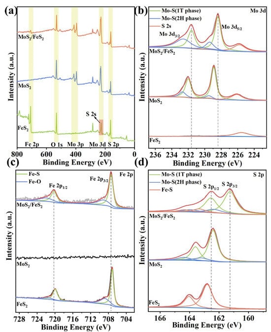 XPS of (a) survey spectra, (b) Mo 3d, (c) Fe 2p, and (d) S 2s of MoS2/FeS2, pure MoS2, and FeS2, respectively.