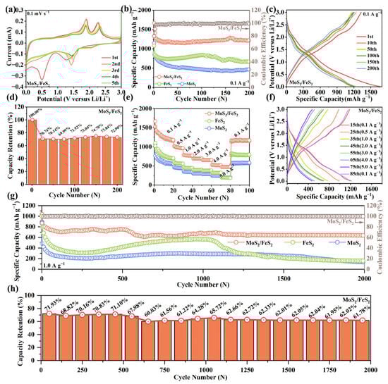 Similarly, the S 2p high-resolution spectrum of MoS2/FeS2 (Figure 2d) exhibits two distinct sets of peaks associated with the Mo–S bond. Specifically, the peaks observed at 161.3 eV and 162.6 eV correspond to the 1T phase, while those detected at 162.4 eV and 164.0 eV are indicative of the presence of the 2H phase. In addition, the remaining set of peaks belonging to Fe–S can be deconvoluted to 163.4 eV and 164.4 eV, respectively. Compared with pure MoS2 and pure FeS2, all the peaks corresponding to Mo–S bonds move to the direction of low binding energy, while all the peaks corresponding to Fe–S bonds move to the direction of high binding energy, and this phenomenon fully confirms the process of electron transfer from FeS2 to MoS2. Widespread Mo–S bonds and Fe–S in MoS2/FeS2 provide good electron conductivity and Faradaic pseudocapacitance. Furthermore, the heterogeneous interface leads to a lopsided charge distribution near the interface, and the corresponding interfacial interaction can boost the electron transfer reactions and offer sufficient active reaction sites for lithium-ion storage. The changes in the Mo–S and Fe–S binding energies demonstrate the interaction between MoS2 and FeS2, which further enhances the adsorption of lithium ions at the interface. Therefore, the XPS analysis confirms that MoS2 and FeS2 were formed synchronously during the hydrothermal reaction. The imbalanced charge distribution occurring in the interfacial region can create an inner electric field [29], and the partial phase transition produces 1T-MoS2 with metallic conductor properties favoring the electronic conductivity of the MoS2/FeS2. Moreover, the heterogeneous interface demonstrates strong covalent chemical bond interaction between the MoS2 layer and FeS2 layer, which is important for interfacial lithium-ion storage. The XPS analysis unambiguously shows that heterogeneous interfaces are formed through the simultaneous generation of the hydrothermal reaction MoS2 and FeS2 and that heterogeneous interfaces enhance interfacial charge migration for lithium-ion storage.