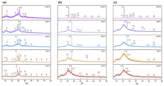 Mineral transformation behavior of BA (a), BA-WA (b), and BA-AW (c). Annotation: 1-1—tridymite, 1-2—cristobalite, 1-3—moganite, 2—AlPO4, 3—CaO, 4—KCl, 5—K2SO4, 6—K2CO3, 7—CaCO3, 8—MgCO3, 9—CaSO4, 10—CaSiO3, 11—K2SiO3, 12—CaCl2, 13—K2CaSiO4, 14—K2O, 15—Al2O3, 16—MgSiO3, 17—Mg2SiO4, 18—MgO.