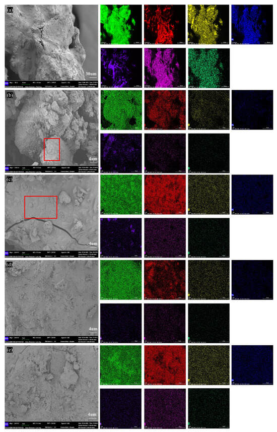 SEM-EDS images of BA at different temperatures. (a–e) Micro-topography of BA, BA-700, BA-800, BA-900, BA-1000. Annotation: red square in subfigure (b) is unmelted ash blocks; red square in subfigure (c) is the unmelted ash blocks occurred to fusion behavior.