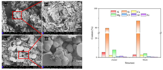 According to the micro-morphology of BA-WA and BA-AW (Figures S1 and S2), there were only two characteristics of the row-like cluster structure and the irregular block structure in BA-WA and BA-AW. Figure 5a–d show that there were dense pores on the surface of the ash skeleton in the microstructure of BA-WA, which were not found in BA-AW. This is due to the thermal decomposition of the alkali salts which were insoluble in water and acid of BA-WA at high temperatures, caused by the overflow of decomposition gas. Table 4 indicates that the surface alkali content of BA-WA was higher than that of BA-AW because there were no dense pores in the ash skeleton in BA-AW. Due to the low fusion point of BA, ash exists in the form of a molten body at high temperatures. There will be no similarly dense pores on the surface of BA because a number of alkali metal salts were decomposed at high temperatures. Figure 5 shows a certain difference in the element content of the two structures. The variation in potassium and magnesium was significant. However, the content of silicon changed slightly.