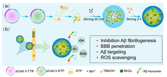(a) Schematic representation of the synthesis of KTP@MnO2. (b) Multifunctional KTP@MnO2: Inhibition Aβ fibrillogenesis, BBB penetration, Aβ targeting, and ROS scavenging.